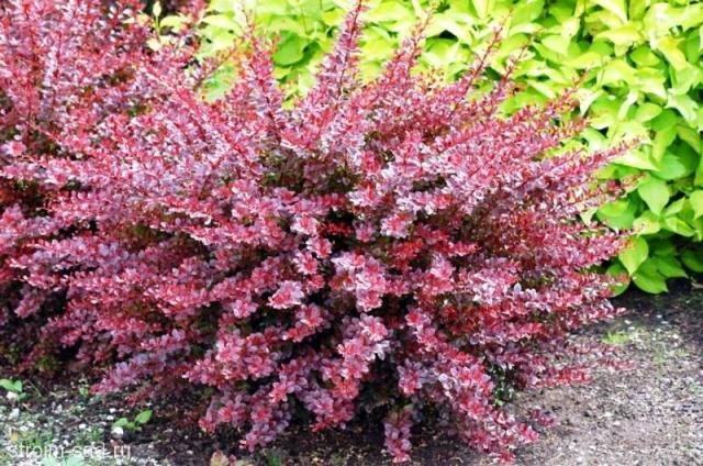 Барбарис Тунберга (berberis thunbergii) — колючий кустарник с компактной, полушаровидной кроной, поднимающейся от самой земли до 2,5 м высоты. Родина барбариса — Китай и Япония. Семейство барбарисовых. Красивы его изящные, округлые мелкие листья, ярко-зеленые летом и огненно-красные, поздно опадающие — осенью. Дугообразно отклоненные побеги придают этому виду барбариса особенную декоративность. Одиночные желтые цветки имеют снаружи красноватую окраску. Плоды у барбариса — ярко-красные, блестящие, ягоды долго держатся на растении, украшая его и в безлистном состоянии. С 5 лет барбарис цветет и плодоносит ежегодно.