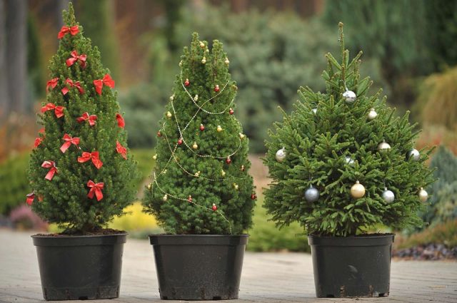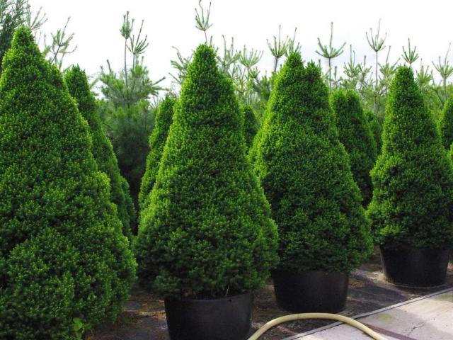 (Picea glauca Conica) Карликовый, очень популярный сорт ели, имеющий вид регулярных, плотных конусов. В возрасте 10 лет достигает 1 м выс. Побеги тонкие, жесткие. Хвоя короткая, зеленая. Требования к почве и влаге средние. Рекомендуется для каменистых или вересковых садов, для выращивания в контейнерах. Очень эффектна. Следует укрывать от зимних солнечных лучей.